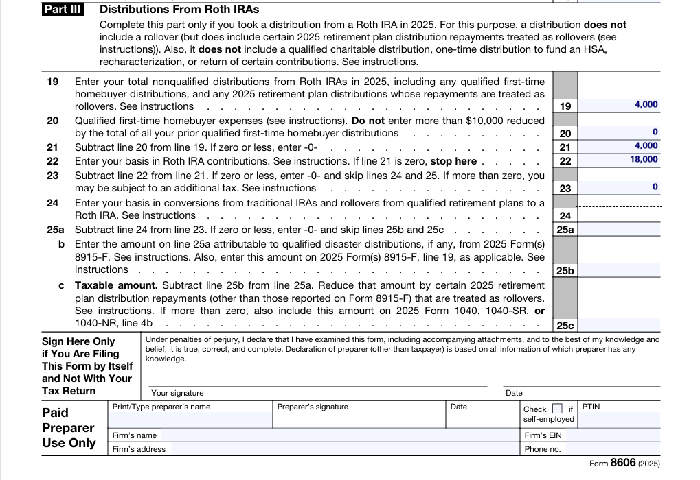 Form 8606 tracks your Roth IRA basis — the total of all contributions you’ve made over the years — and shows the IRS why your distribution isn’t taxable.