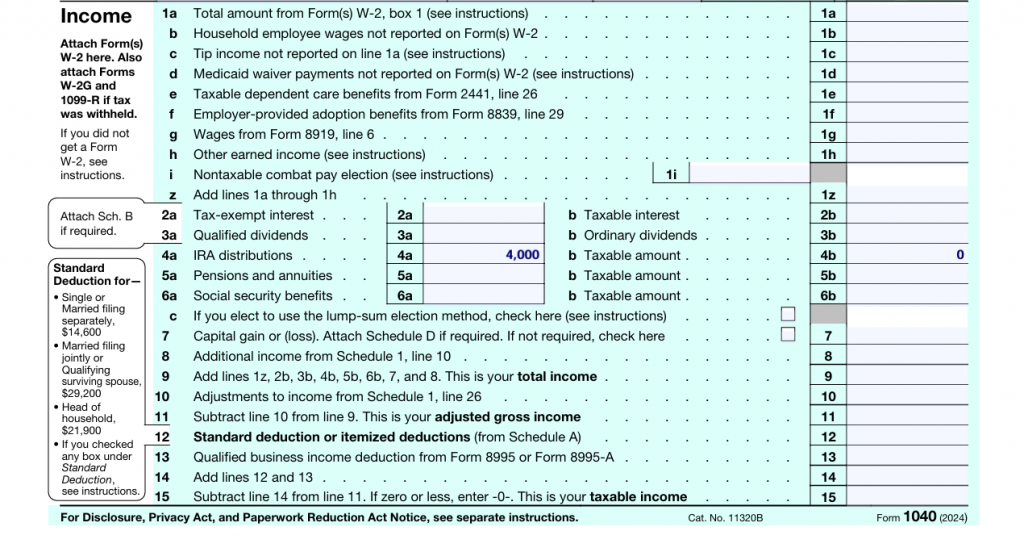 4. On Form 1040, Line 4a showed $4,000, Line 4b showed $0.