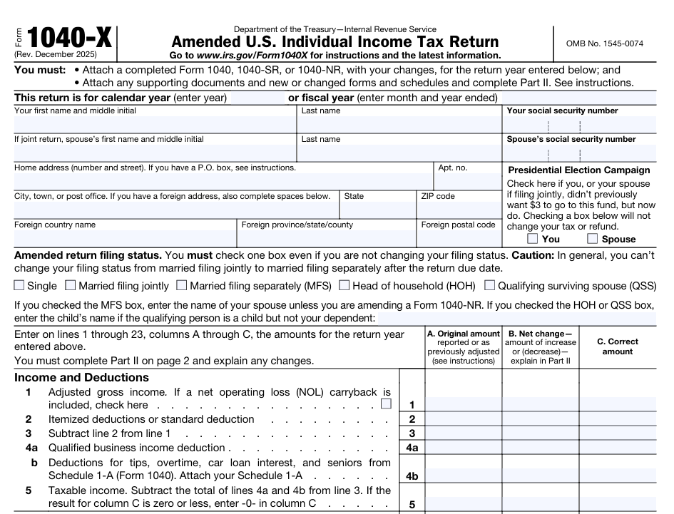 An amended federal individual tax return is filed on Form 1040-X. It is used after the original return has already been filed and is generally used to correct important items such as filing status, income, deductions, credits, dependents, or total tax liability.